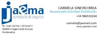 JAEMA CORREDURÍA DE SEGUROS, S.LAvenida de Juan Carlos 1, 20 Local 1 · VILAGARCÍA DE AROUSA · Pontevedra Telefono: 678467352Email: carmela@jaemasl.comWeb: www.jaemasl.com